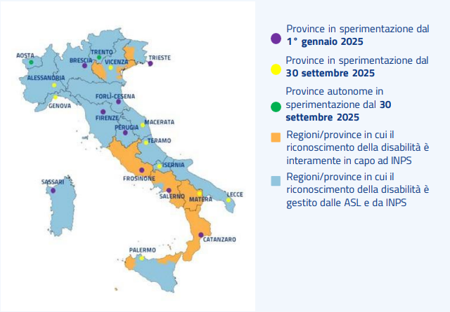 Il 1° gennaio 2025 ha segnato l’avvio della prima fase della sperimentazione sulla valutazione di base in nove province. Il 30 settembre 2025, è stata avviata una seconda fase su ulteriori nove province delle undici individuate. Le patologie oggetto di sperimentazione sono il diabete tipo 2, la sclerosi multipla e i disturbi dello spettro autistico. Verranno prossimamente aggiunte in questo novero artrite reumatoide, cardiopatie, broncopatie e malattie oncologiche.