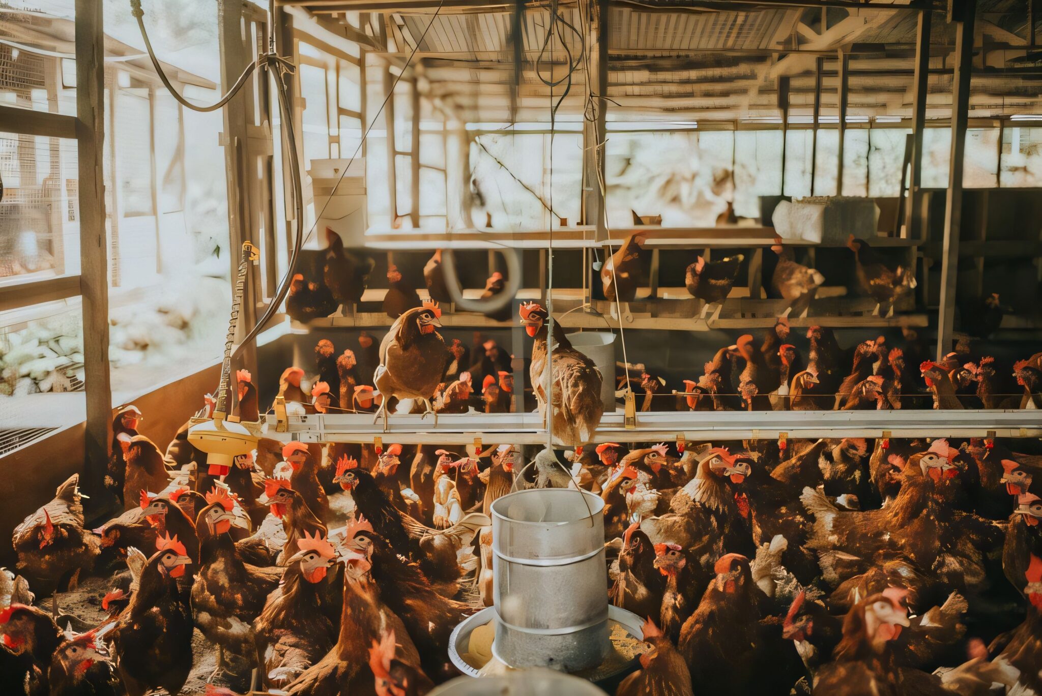 A bustling chicken farm with hens in a spacious indoor setting, highlighting poultry farming and livestock care.