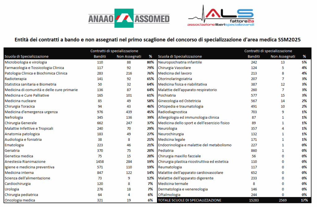 u 15.283 contratti regionali a bando per il concorso di specializzazione in Medicina, ben 2.569 (17%) non sono stati assegnati, numero destinato ad aumentare vertiginosamente a causa delle centinaia di mancate effettive immatricolazioni. Continua inoltre la tendenza negativa per le cosiddette specializzazioni meno ambite, prima tra tutte la medicina d’emergenza-urgenza (45% dei contratti non assegnati). I risultati delle assegnazioni del concorso di specializzazione 2025 si confermano come un “disastro annunciato”.